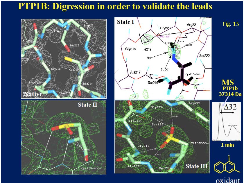 8.5. Subtle insights along the way (protein oxidation). Through my professional years as a protein crystallography in the pharmaceutical industry, I have probably looked at and studied hundreds or even thousands of electron density maps, looking for subtle details of the conformation(s) and interactions of hundreds of small molecule ligands with their corresponding target in crystallographic complexes, either after soaking or via co-crystallization. This was particularly true when the crystallographic screening was fully implemented at Abbott Laboratories. Of course, there were successes and failures. I am going to focus on a particular insight that came to me after months of agonizing work with PTP1B, a critical protein in the pathway of glucose signaling and an important target for the possible treatment of type II diabetes. Like many other pharmaceutical companies, Abbott Labs had a program targeting PTP1B with the goal of developing potent and reversible inhibitors of this target for the treatment of the conditions mentioned above. Following the most successful methodology of the time, HTS (high throughput screens) were performed on the extensive Abbott compound collection in an attempt to identify active compounds that could be used as starting scaffolds for further medicinal chemistry optimization. The most striking result of these screens was the identification of a couple of low molecular weight (~ 200 Daltons) isoquinoline diols that appeared to inhibit PTP1B at the sub micromolecular level (0.6 uM). The project team and the medicinal chemists within the team were particularly interested in seeing how these compounds bound into the active site and how they could be modified to increase their potency. As the protein crystallographer in the team, I was assigned to find the answers to these important questions. Several months of perplexity and frustration followed. I repeatedly soaked fresh crystals of PTP1B with concentrated solution of the isoquinoline diols and collected data of excellent quality in our in-house laboratory. The compounds could not be found near the active site or anywhere else within the pockets or crevices of the protein. Eventually, as I became more familiar with the detailed density near the active site, what appeared to be minor alterations of the native density became consistently apparent: something was going on! I consulted with my chemist/biochemist colleagues at Abbott and eventually a logical explanation was found. Somehow, the small compounds were oxidizing the active site cysteine (Cys215) in various stages. Controlling the soaking time, concentration of the ligands in the soaking solution and the age of the crystals, I was able to characterize the three stages of the oxidation of the –SH group in Cys215: sulfenic (-SO), sulfinic (-SOO) and sulfonic (-SOOO). The compounds inhibited the enzyme by oxidating the active site Cys215 and rendering it inactive (Fig. 15). This subtle chemical effect prevented the binding of any other ligand to the active site by changing dramatically its chemical properties. The successful soaking of ligands in native PTP1B crystals required a careful control of the oxidation state of the protein and crystals well beyond the standard addition of DTT and other protective additives.